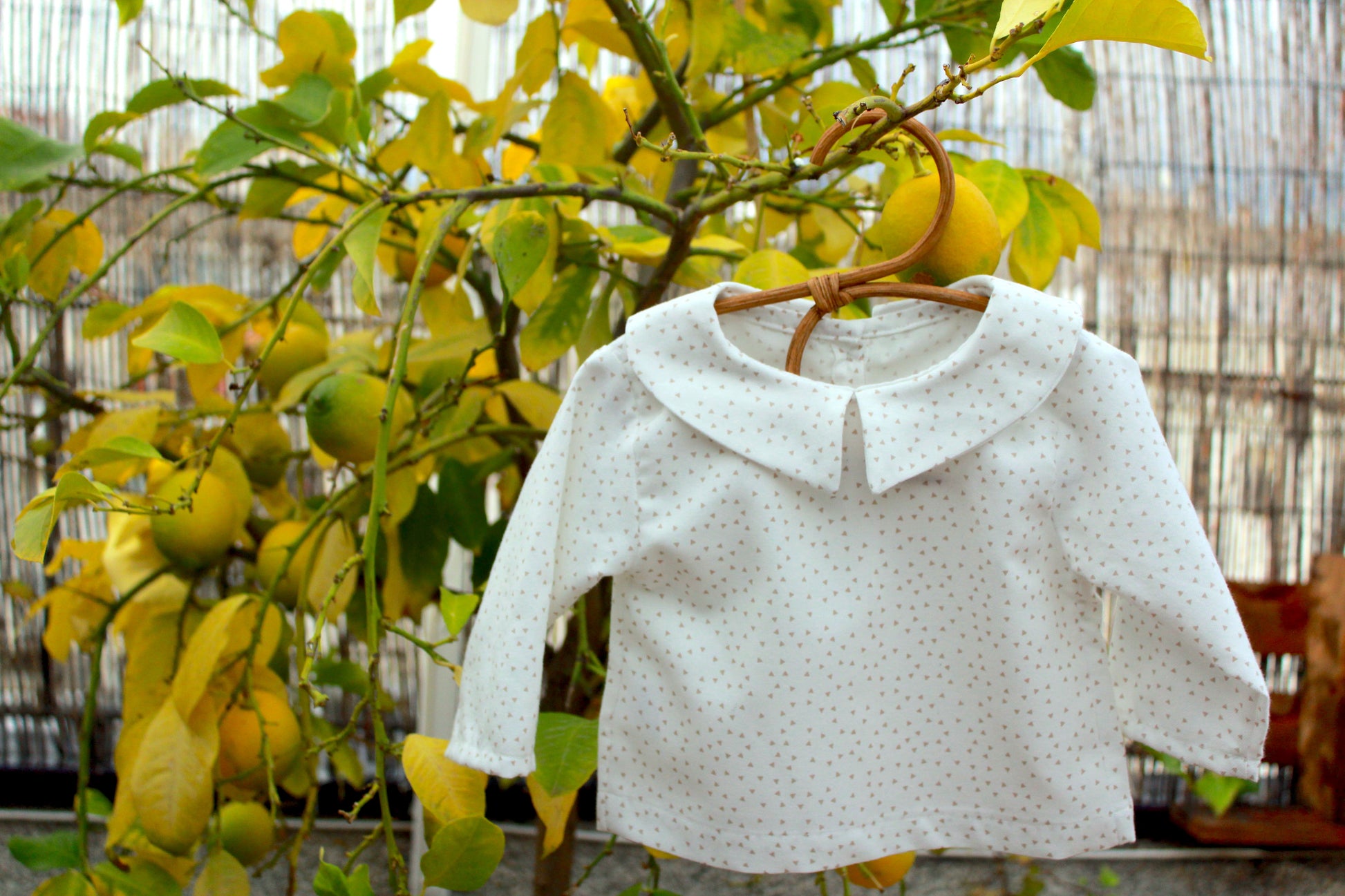 Diseñada en un tono neutro con un estampado de pequeños triángulos marrones, aporta un estilo tierno y minimalista. El cuello bebé amplio le da un toque clásico y encantador, mientras que la abotonadura trasera con botones de madera facilita el vestir y añade un detalle cálido y artesanal.