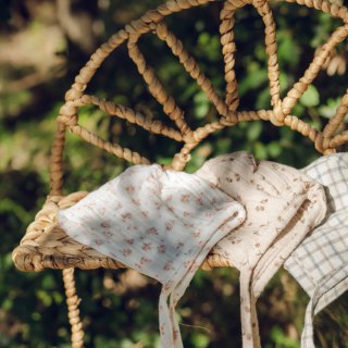 Capota infantil de algodón ligero en blanco roto con estampado de pequeñas flores rosas. Diseño redondeado y tiras para anudar bajo la barbilla: cómoda, delicada y perfecta para looks veraniegos o eventos especiales.